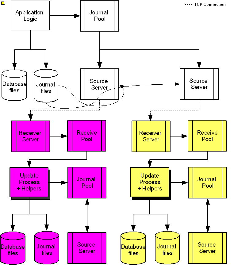 On Rose and Yellow instances, a Receiver Server receives update records sent by the White Source Server and puts them in the Receiver Pool, which is in a shared memory segment. Source and Receiver Server processes implement flow control to ensure that the Receiver Pool does not overflow. The Update Process picks these update records and writes them to the journal file, the database file, and the Replication Journal Pool. The Update Process on a replicating instance performs operations analogous to “Application Logic” on the originating instance.