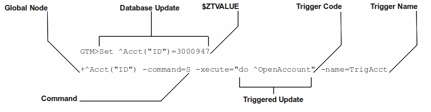Suppose you want to set up a trigger called TrigAcct on every s ^Acct("ID") to invoke the routine ^OpenAccount. Your trigger definition file may have an entry like +^Acct("ID") -command=S -xecute="do ^OpenAccount" -name=TrigAcct. The following diagram identifies the different parts of this trigger definition: