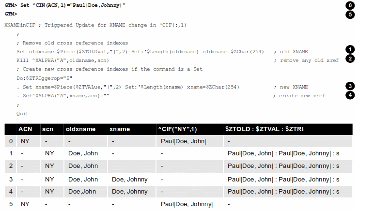 XNAMEinCIF ; Triggered Update for XNAME change in ^CIF(:,1) Set oldxname=$Piece($ZTOLDval,"|",2) Set:'$Length(oldxname) oldxname=$zchar(254); old XNAME Kill ^XALPHA("A",oldxname,acn); remove any old xref ; Create a new cross reference if the command is a Set Do:$ZTRIggerop="S" . Set xname=$Piece($ZTVALue,"|",2) Set:'$Length(xname) xname=$zchar(254) ; new XNAME . Set^XALPHA("A",xname,acn)="" ; create new xref ;When the XNAME piece of a ^CIF(:,1) node is SET to a new value or KILLed, after obtaining the values, an unconditional KILL command deletes the previous cross reference index, if it exists. The deletion can be unconditional, because if the node did not previously exist, then the KILL is a no-op. Then, only if a SET invoked the trigger (determined from the ISV $ZTRIGGEROP), the trigger invoked routine creates a new cross reference index node. Note that because GT.M implicitly creates a new context for the trigger logic we do not have to worry about out choice of names or explicitly NEW any variables.